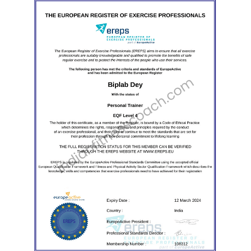 His certifications, including EREPS (European Register of Exercise Professionals) Certified Personal Trainer EQF Level 4, underscore his dedication to delivering high-quality, personalized training programs.